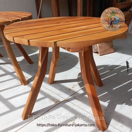 Meja teras minimalis kayu bundar tepi adalah meja luar ruangan berukuran ringkas dengan dirancang untuk digunakan di area terbuka seperti teras, balkon dll.